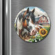 Hübscher Magnet mit einem braunen, schwarz-weißen gepunkteten Pferd, umgeben von Sonnenblumen und einer rustikalen roten Scheune im Hintergrund. Niedlich für ein Bauernhaus oder rustikales Thema oder für alle, die Pferde Lieben.