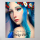 Träumen Sie groß und leben Sie Ihre Märchen Zitat. Hübsches zauberhaftes Märchen mit blauen Haaren und rot-weißen Blume in ihren Haaren und blauen Augen. Fantasiekunst ai art. generativekontrolle