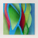 Eine abstrakte Landschaft mit lebhaften Farben und Texturen, die Hügel in grünen, blauen, zyanfarbenen, roten und rosa Schattierungen zeigt.