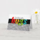 Senden Sie "Umarmungen", Grußkarte. Die Karte ist perfekt, um Ihnen die Pflege und den Komfort zu zeigen. Schwarz-Weiß-Polka-Punkte mit großen, bunten Schriftzeichen für HUGS.