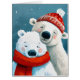 Cette image montre deux ours polaires dans une étreinte chaleureuse, dressée contre un arrière - plan enneigé et de tonalité turquoise. L'ours plus gros porte un casquette tricot rouge, décoré de motifs subtils, tandis que l'ours plus petit est enveloppé d'une écharpe rouge vif. Les deux ours ont des joues douces et roses et des expressions sereines, créant une atmosphère d'hiver douillette et affectueuse. Le style texturé et peint renforce la chaleur et le charme de la scène.