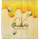 Gelber, weißer Hintergrund mit einem Bienenwabenmuster und glücklich lächelnden Hummeln. Dekoriert mit süßem, goldenem Honig, der tropft. Personalisieren und fügen Sie Ihren Namen und Ihre Monogramm-Initialen, goldene und schwarze Buchstaben. Der Name wird mit einem handgeschriebenen Stilskript geschrieben.
