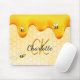 Gelber, weißer Hintergrund mit einem Bienenwabenmuster und glücklich lächelnden Hummeln. Dekoriert mit süßem, goldenem Honig, der tropft. Personalisieren und fügen Sie Ihren Namen und Ihre Monogramm-Initialen, goldene und schwarze Buchstaben. Der Name wird mit einem handgeschriebenen Stilskript geschrieben. Ideal für Ihre Zuhause im Sommer.