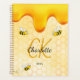 Gelber, weißer Hintergrund mit einem Bienenwabenmuster und glücklich lächelnden Hummeln. Dekoriert mit süßem, goldenem Honig, der tropft. Personalisieren und fügen Sie Ihren Namen, Monogramm-Initialen und Jahr, golden und schwarz Buchstaben. Der Name wird mit einem handgeschriebenen Stilskript geschrieben.
