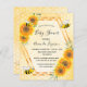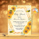 Elegante, lustige Baby Dusche Einladung, geschlechtsneutral. Gelber Hintergrund mit goldenem Wabenmuster. Mit einem Imitat goldener geometrischer Rahmen. Gelbe, orangefarbene Sonnenblumen und glückliche Hummeln. Mit dem Text: Baby Shower und der Name der Mami auf der Vorderseite geschrieben mit einem modernen handgeschriebenen Stil Skript. Schwarze Buchstaben. Zurück: gelbes, weißes Wabenmuster und eine lächelnde Hummel