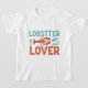 Im T - Shirt-Design steht der Text "Hummer Lover" in einem spielerischen, handgeschriebenen Schriftart, umgeben von farbenfrohen, skurrilen Hummer-Themen wie Blasen, Algen und Muscheln. Das Gesamtdesign vermittelt ein Gefühl von Spaß und Freude und feiert die Liebe von Hummer und Ozean.
