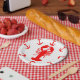 Papier Party Teller mit einem roten Hummer mit rotem Ankertrimm auf weißem Hintergrund.