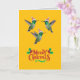 Drei Kolibris, die dicht nebeneinander herumschweben, tragen Weihnachtsmannmützen.