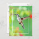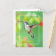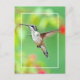 Ein Kolibri, der mitten in der Luft fotografiert wurde, mit Blume mit weichem Fokus als Hintergrund.