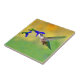 Diese wunderbare Kachel zeigt einen zarten Kolibri, der an einer hellblauen Blume füttre. Hummingvögel sind die einzigen Vögel, die sowohl vorwärts als auch rückwärts fliegen können, aber auch in der Luft schweben, seitwärts fliegen und sogar verkehrt herum fliegen.