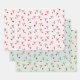 Valentine's Day wrapping paper for hummingbird lovers featuring hand-painted male and female Rufous hummingbirds, Anna's, Allen's, and Ruby-throated hummingbirds carrying hearts on a pink, green, and light blue background.