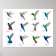 Unique poster featuring several hand-painted species of colorful hummingbirds such as Mango Hummingbirds, Velvet-purple Coronet Hummingbird, blue-throated Starfrontlet, Golden-tailed Sapphire, Dusky Starfrontlet, and Mexican Violet-ear Hummingbirds among others. Images taken from my original watercolor paintings.