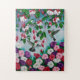 Schwänzende Kolibris fliegen, trinken Nektar aus den Blume in einem bunten Frühlingstraum, der mit lila, roten, weißen und rosa Fuchsias und Petunien gefüllt ist. Realistische Kunstwerke, die aus einer Ölmalerei des Künstlers Crista S. Forest entstanden sind.