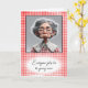 Eine schmutzig aussehende alte Dame in einem Gingham-Kleid auf verblasstem Rot-Weiß-Gingham-Hintergrund, um alten Spaß zu bekommen. Alle Texte können bearbeitet werden.