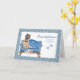 Niedliche Grußkarte mit Hund auf der Couch, Vorhut und Brille. Der Hintergrund blau ist mit einem Knochenmuster