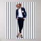 Hund Kopf menschlichen Körper. Der Hintergrund ist mit schwarzen vertikalen Streifen