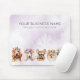 Ein charmantes Mauspad mit hübschen Hunden mit Blume Kronen auf dem Kopf. Ihr Shop/Firmenname und Platz für einen benutzerdefinierten Text. Diese Sammlung von hübschen und süßen Hunden mit Blume "in ihren Haaren" zeigt Ihrem Kunden, wie sich sein Freund verwöhnt und wie ein Gönner in Ihrem Tierpflegegeschäft behandelt wird. Illustration mit bunten Blume im Aquarell-Stil. Golden Retriever, weißes Poodle, französischer Bulldogge, Spitz und ein Dalmitist.