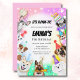 Diese Einladung enthält einen französischen Bulldog, Samoyed, Jack Russell Terrier, Deutscher Schäferhund, Malteser, Corgi, Shih Tzu, Akita Inu und einen anatolischen Schäferhund auf einem Aquarell mit einem Keksteig Vanillekuchen und Pfotenabdruck.