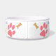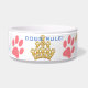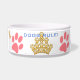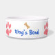 Wir wissen, wer das Haus regiert - Dieses große Hundeschuhlchen zeigt eine originelle Abbildung einer goldenen Krone aus Hundeknochen und Pfotendrucken durch ZoeSPEAK. Es gibt auch vier rosa Hundepaws, die um die weiße Schüssel gedruckt werden, und die Wörter "DOGS RULE!" in blau. Zwischen zwei Pfotendrucken zentriert ist ein blauer Text, der "King's Bowl" heißt. Dies ist Set, um mit dem Namen Ihres Hundes oder mit allem anderen, was Sie wollen, zu personalisieren.