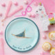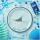 Ein Hund mit einer aquamarinen Schlittentasche überlagert auf einem verschneiten Hintergrund. Fügen Sie Ihren eigenen Text sowohl unten als auch auf dem Schlitten.