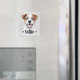 Foto Kühlschrankmagnet mit dem eigenen Foto mit dem Namen des Tieres als schwarzes (oder benutzerdefiniertes) Texteüberlagerungen, flankiert von zwei Herzen.
