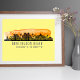 Das stilvolle Poster bietet Huntington Beach, die Silhouette der Stadt CA mit Breiten- und Längenkoordinaten und eine orangefarbene Aquarellwäsche auf gelbem Hintergrund.