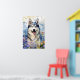 Farbenfrohe Aquarellkunst eines Huskys, der auf einem Feld von Frühlingsblumen sitzt.