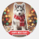 Realistic Husky puppy wearing a festive red scarf, sitting on a table with New Year decorations and tiny lights. Bright, lively, and photorealistic Happy New Year sticker