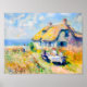 Ein friedliches impressionistisches Gemälde einer Hütte mit Strohdach am Meer. Die warmen Farben, die üppige Vegetation und der ruhige Ozean schaffen eine gemütliche und nostalgische Küstenlandschaft.