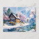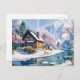 Lebhafte Abbildung einer Hütte im Frühling. Schmelzen von Eis und blühenden Bäumen bringen Leben in die Szene, ideal für die Natur und saisonale Designs.