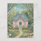 Dieses skurrile Kunstwerk zeigt eine zauberhafte rosa Hütte inmitten eines üppigen, bezaubernden Waldes. Die Hütte mit ihrem schieferblauen Dach und der einladenden aquamarinen Türe ist umgeben von einer Fülle von bunten Wildblumen in einer sanften, Frühlingspalette. Ein kurvenreicher Steinweg führt den Betrachter zur Haustür, während die Szene von den umschlungenen Zweigen zweier großer stilisierter Bäume gerahmt wird. Der Himmel ist ein ruhiger, aquamariner Himmel mit sanftem Vollmond und leichten Wolken, der die magische, Storybook-Atmosphäre noch verstärkt. Dieses Stück erinnert an ein Gefühl von Ruhe, Nostalgie und rustikalem Charme.