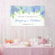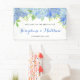 Dieses Hochzeitsbanner zeichnet sich durch ein Aquarellblau-Hydrangea-Design mit grünem Blattwerk aus. Personalisieren Sie es mit Braut- und Bräutigam-Namen. Matching-Elemente sind ebenfalls verfügbar. Bitte besuchen Sie unseren Shop oder schauen Sie sich unsere Kollektionsseiten an, um das komplette Sortiment zu sehen.