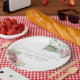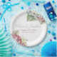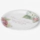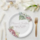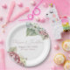 Diese romantischen Teller mit Blumen sind mit Aquarellen in Rosa und Weiß-Hydrangeas ausgestattet. Ein zarter Strauß an Hydrangea-Blume wird oben abgebildet, ein anderer unten. Die Namen eines Musterpaar werden in der Mitte in einem eleganten Script-Schriftart gedruckt, gefolgt von einem Hochzeitstag und einem Ort.