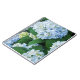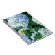 Notizbuch gezeigt mit einem Fotodruck der hübschen blauen Hydrangea-Blumen.