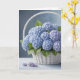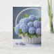 Ein weißer Korbkorb mit blauen und violetten Hydrangeas liegt auf einer Oberfläche mit zusätzlichen Blüten auf dem Tisch Alle Texte können geändert werden.