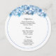 Menükarte auf weißem Basispapier in runder Kreissaison mit Hydrangeas-Foto. Die Namen des Ehepaares sind auf der Rückseite. Skript und Standardtext in Schwarz. Klicken Sie auf die Schaltfläche Anpassen, suchen Sie nach rechts und finden Sie geeignete Felder, um Ihre Informationen zu ändern. Archivbild freepik.com