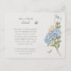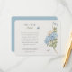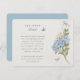 Diese atemberaubende Hochzeitsinformationskarte zeichnet sich durch delikate blaue Hydrangeas und weiße Blüten aus, die elegant mit weichem grünem Blattwerk kombiniert sind. Das anmutige Design besteht aus subtilen Touchs eines Blauvogels und Schmetterlings, die einen skurrilen und ruhigen Charme verleihen. Diese Karte ist ideal, um wichtige Details wie Wegbeschreibungen, Zeremoniedetails und Geschenkvorlieben zu vermitteln. Sie kombiniert Vintag inspiriert Kunstwerke mit moderner Funktionalität. Ideal für Paare, die eine raffinierte und zeitlose Möglichkeit suchen, zusätzliche Informationen mit ihren Gästen zu teilen.