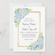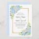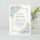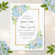 Diese Einladungen sind modern und mit blauen Hydrangea-Blume, weißen Rosen-Blätter, Blattwerk und einem goldenen Imitat gestaltet. Personalisieren Sie sie mit Ihrem eigenen Text.