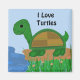 Eine coole Schildkröte macht sich bereit, ins Wasser zu gehen. Grüne Schildkröte mit einer bräunlich schattigen Muschel. Gras und kleine Blume am Wasser.