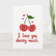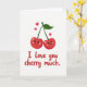 This greeting card features two bright red cherries in the center on a plain white background, linked together by a curved green stem with one green leaf. Each cherry has big shiny black eyes, a wide happy smile, and a soft pink blush on its cheeks that makes them look friendly and sweet. The cherry on the right has its mouth slightly open with a tiny pink tongue showing, like it’s mid-giggle. Three small dark pink hearts float around them, adding a clear romantic touch. Under the cherries, the card reads “I love you cherry much” in red handwritten-style lettering. The simple layout keeps the focus on the cute pair and their cheerful expressions, making it feel perfect for love or close friendship.