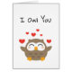Kleine niedliche und fröhliche Eule-Illustration mit herumfliegenden Herzen. Ein lustiger Vogel in hellbraunen Farben und mit hellgelben Pfoten. Diese Eule bringt Glück und Liebe, und freut sich, Sie aufzurufen oder jemandem, den Sie mögen, beste Wünsche zu schicken. Sie können den Hintergrund auch für Ihre Bedürfnisse anpassen.