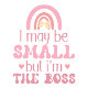 Das Bild zeigt einen T - Shirt mit weißem Kindermotiv und einem farbenfrohen Design. Das Design beinhaltet einen Regenbogen und die Phrase "Ich mag klein sein, aber ich bin der BOSS" in rosa und rotem Text, mit kleinen Herzformen betont. Dieser T - Shirt ist wahrscheinlich für Kleinkinder gedacht und vermittelt eine unterhaltsame und selbstbewusste Botschaft.