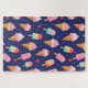 Pattern on blue background with creamy ice cream and popsicles, cherries and confetti floating around. Cute whimsical food design.
