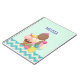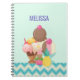 A personalized spiral notebook illustrated with drawing of a 3 scoop ice cream sundae with colorful sprinkles. An ice cream cone with scoops of chocolate, strawberry and vanilla. A bowl of neopolitan ice cream with a cherry on top. Strawberries and a pineapple fruit sit beside the bowls. Summery and sweet. A cream and blue chevron pattern along the bottom edge.