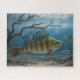 Beneath the frozen water, a perch fish notices bait cast by a fisherman above.