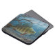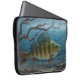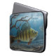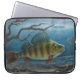 Beneath frozen water, a perch fish notices bait cast by someone ice fishing above.