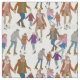 Ein wiederholt gezogenes Stoffmuster aus Aquarelleis-Skatern zeichnet sich durch anmutige Skater in mittlerer Bewegung aus, die in weichen, flüssigen Pinselstrichen gefangen werden, die nahtlos über den Stoff fließen. Die Skater sind in verschiedenen Posen dargestellt, mit sanften Waschungen cooler Blues und Silber, die eine traumhafte, winterliche Atmosphäre vor einem blassen, frostigen Hintergrund schaffen.