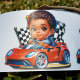 Dieses bezaubernde afroamerikanische Kleinkind ist bereit, das große Rennen in seinem roten Sportwagen zu gewinnen.