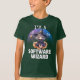 Dieses Bild zeigt eine Hexe mit einem lila Hut und einem schwarzen Kleid, sitzt auf einem Haufen Blätter und hält einen Besen. Sie hat langes, hellblaues Haar und große, braune Augen. Der Hintergrund ist ein halbtransparenter lila und blauer Farbverlauf mit einem Binärkodemuster. Der Text "I'M A SOFTWARE WIZARD" erscheint unterhalb der Hexe. Das Bild legt einen spielerischen und humorvollen Blick auf die Idee eines Softwareentwicklers als magische Figur nahe. Der binäre Code-Hintergrund verstärkt diese Verbindung zur digitalen Welt weiter. Die Ästhetik ist skurril und lustig, mit einer Touch von Launen.