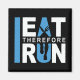 Grunge-Stil Typografie-Design-Emblem mit dem Wort "I Eat darum I Run" in fett san serf Buchstaben mit Silhouette aus dem Buchstaben "A" in Eat (Gabel und Messer) und aus dem Buchstaben "U" in RUN (Silhouette von Laufbeinen/Füßen).